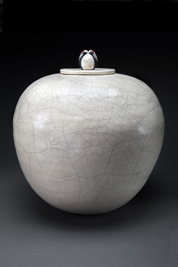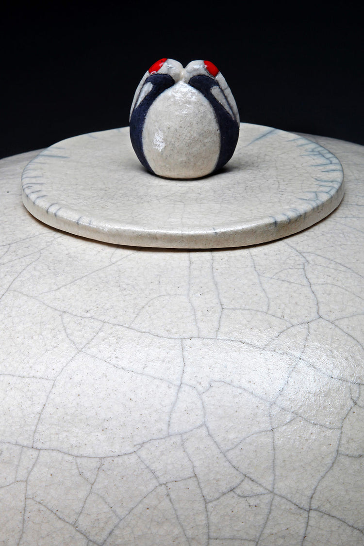 This modern, handmade pot inspired by the elegant head and neck of the Red Crowned Crane will be a beautiful addition to your home decor. Made with raku fired clay that gives the sculpted piece its unique style.