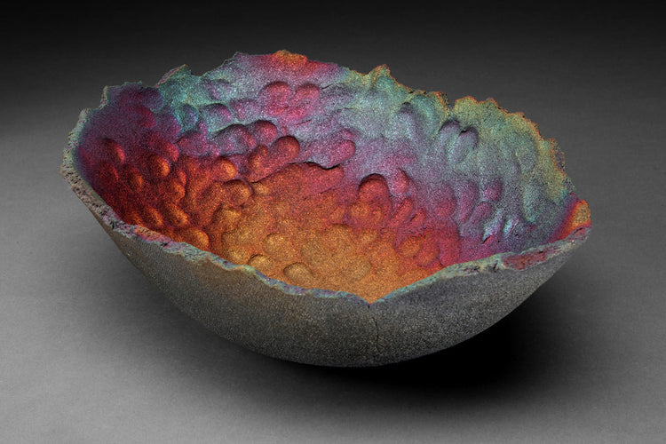 This handmade bowl with black underglaze finish and fumed iridescent interior makes the perfect centerpiece for any occasion. Inspired by nests in general and what I would like if I were a bird in particular.