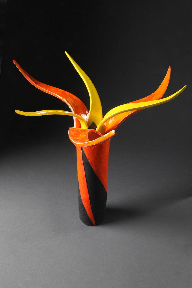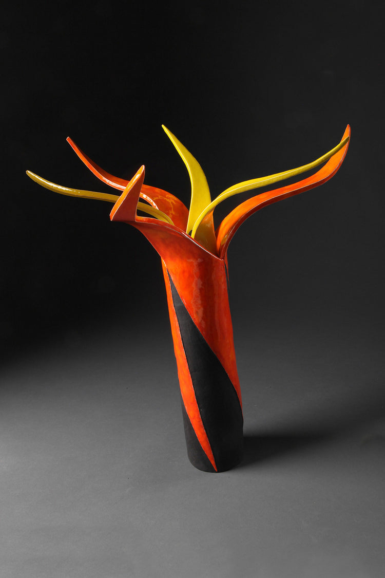 Brighten up your home with this vibrant glaze fired vase. This sculpture was inspired by the unruly head feathers of the Royal Penguin.